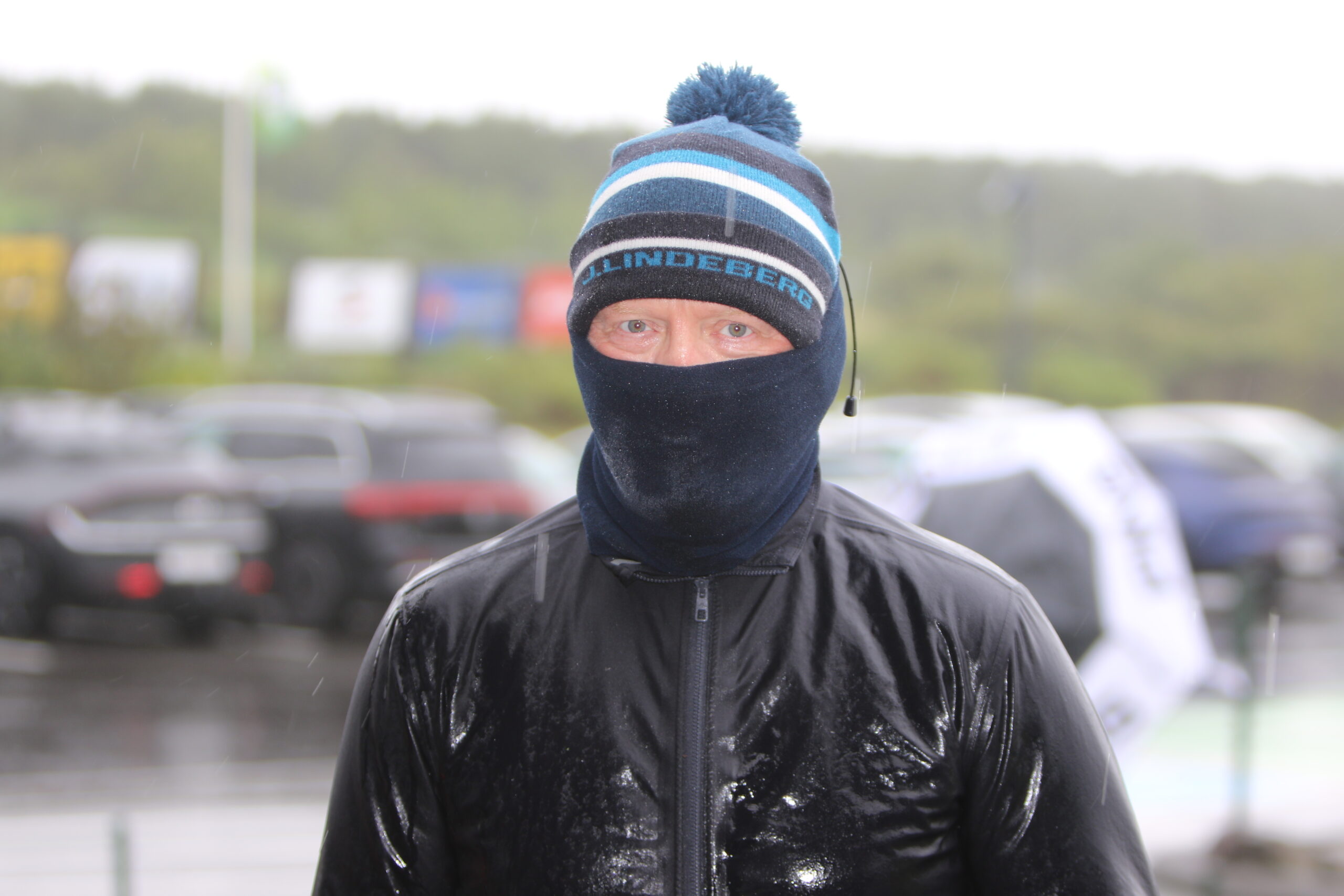 - Hér sjáum við varla hver er á ferð og verið að verja sig frá rigningunni og þetta dugði ekki til.